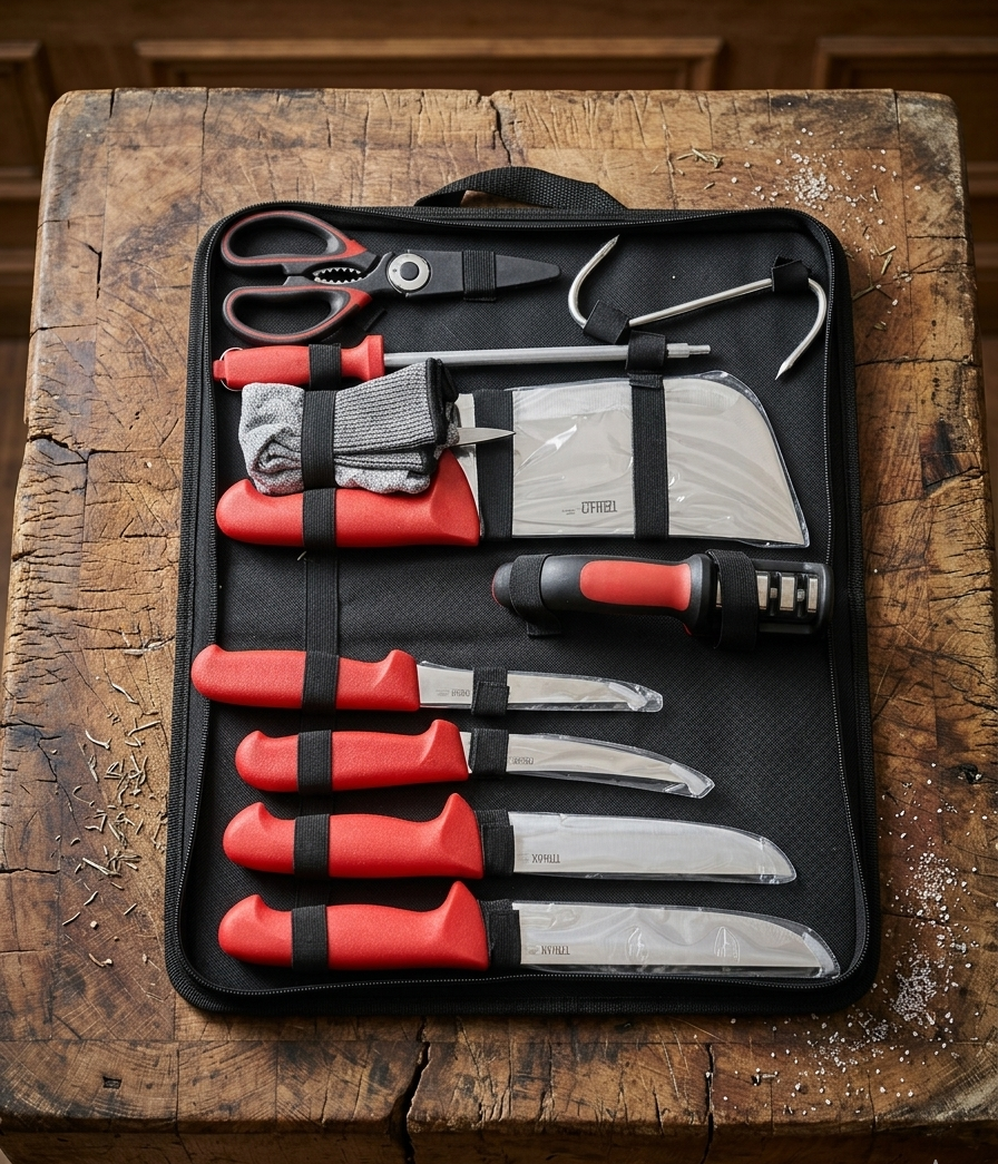 حقيبة أدوات الجزارة والسلخ المتكاملة - الإصدار الاحترافي صُممت هذه المجموعة لتلبي احتياجات المحترفين والهواة على حد سواء، حيث تجمع بين الجودة العالية والتصميم العملي الذي يضمن لك الدقة والراحة أثناء الاستخدام. الأدوات مصنوعة من مواد مقاومة للصدأ مع مقابض مريحة لليد لضمان التحكم الكامل. محتويات المجموعة: سكاكين متعددة المهام: تضم المجموعة 4 سكاكين بمقاسات وأشكال مختلفة، تشمل سكين التقطيع، سكين السلخ، وسكين النزع، لتغطية كافة مراحل التعامل مع اللحوم. ساطور احترافي: ساطور بوزن مثالي وشفرة عريضة لتقطيع العظام والقطع الكبيرة بجهد أقل. مبرد مسن (مصقل): للحفاظ على حدة الشفرات وضمان أداء مثالي في كل مرة. مقص قوي ومسنن: مخصص للمهام التي تتطلب قوة قص إضافية. خطاف يدوي: للمساعدة في تثبيت اللحوم والتحكم بها أثناء العمل. قفاز واقي: قفاز مصنوع من خيوط معدنية مرنة للحماية من الجروح وتوفير أمان أقصى. مسن يدوي إضافي: مسن بفتحات متعددة لتجديد حدة السكاكين بسرعة وسهولة. حقيبة تنظيم فاخرة: حقيبة سوداء متينة مزودة بأحزمة تثبيت داخلية، مما يجعلها سهلة الحمل والتخزين ويحافظ على الأدوات في مكانها. لماذا تختار هذه المجموعة؟ شفرات حادة: مصنوعة من فولاذ عالي الجودة يدوم طويلاً. مقابض مريحة: مقابض باللون الأحمر المميز مصممة لمنع الانزلاق وتوفير راحة تامة لليد أثناء العمل الطويل. توفير المساحة: حقيبة مدمجة تحمي أدواتك من الرطوبة والتلف وتسهل التنقل بها. مثالية للاستخدام المنزلي في المناسبات، أو كطقم أساسي للجزارين في المحلات والمسالخ